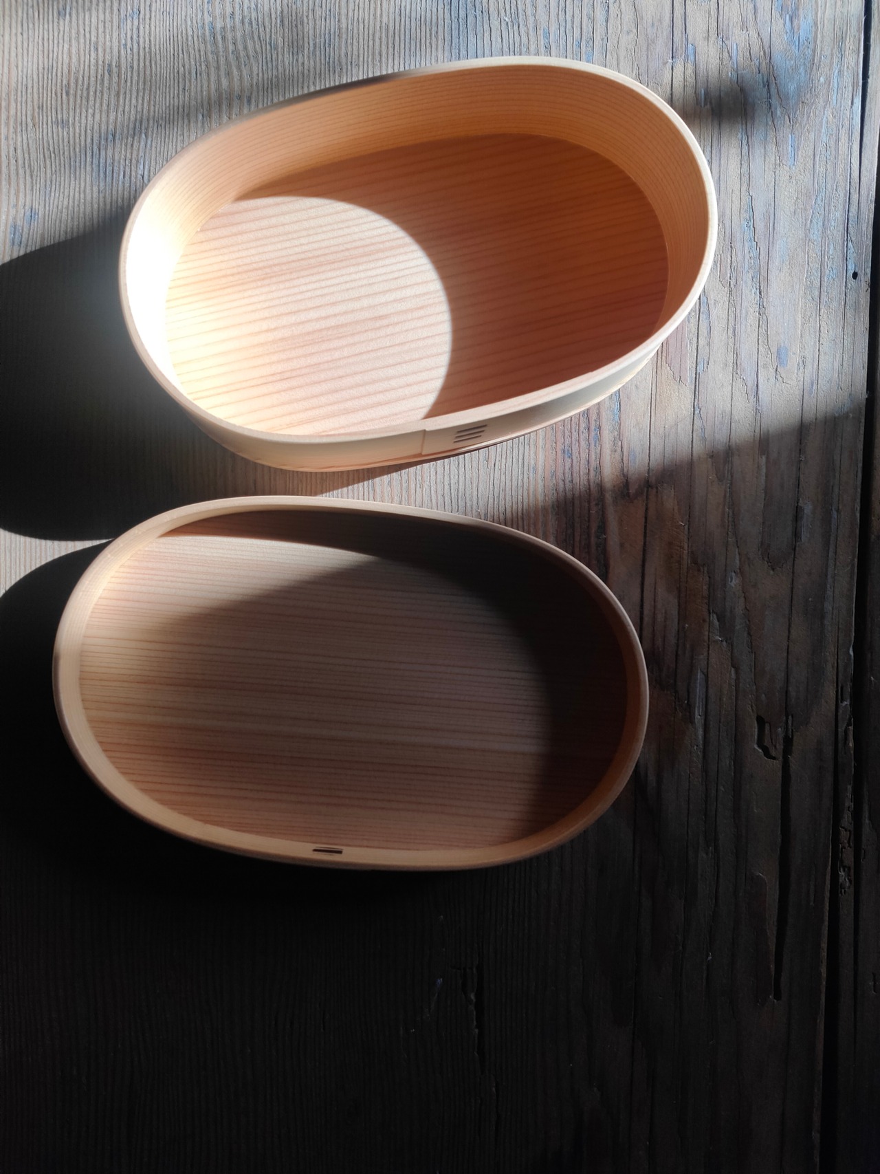 ほんのりと杉が香る秋田杉を使った大館工芸社の人気の小判型の曲げわっぱ弁当。*写真3枚目上(中)より浅く一回り小さなサイズです。